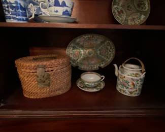 ASIAN INSPIRED: Lots of Rose Medallion, Canton, Imari, Lamps, Plates, Teapots, Vases, Tureen, Umbrella stand, Warming plates, Bronze foo dog, other foo dogs, buddha figures…