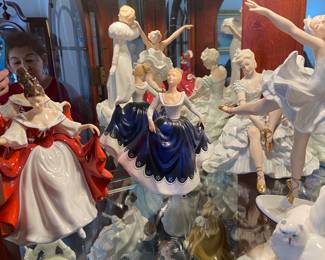 CHINA, PORCELAINS, AND POTTERY: Complete set for 12 Noritake China in the Kingston Pattern, Set of Limoges Dinner Service, Incredible collection of large and small Dresden Figures and Lamps some with crossed swords mark, Royal Doulton figures and Tobies, Hummels, LLadro, Belleek, Belgian, Limoges, Nippon, Wedgewood… Outstanding!!!