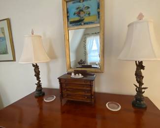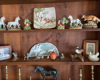 MANY MANY ITEMS OF INTEREST: Spectacular KPM Plaque of the birth of Christ, * An important Collection of Miniature Carved of Painted Geese in Flight by Lacey dated “48” Miniature Duck Carvings by W. Reinbold, Framed Goldfish by Reinbold. Willard Banjo clock as well as other clocks. Lots of Fireplace (Several Fireplaces in this house) including gilt important Hercules and Cerberus Fire Screen, Very Large Selection of Antique Brass Candlesticks, Collection of Brass, Copper and Pewter, Large collection of Tea caddies, Old Samplers, Many electrified Oil Lamps, Bronze Figural Lamps, Tole Lamps, Porcelain Lamps, Lamp shades, Art Deco Horse Lamp, Floor Lamps, Desk Set, Books, Bookends, Old decanter set set in false Book, Mirrors, Miniature antique furniture, 2 Glassed case carvings of Jesus and Mary, Work Bench, Lots of outdoor metal furniture including unusual tete a tetes and Seahorse metal set, Large Iron and Marble Table, Carved Birds, Sculpture of Diana at the Well by J. Yates 1921, Table linens and bed linen. Kitchenware- some vintage.
