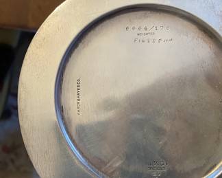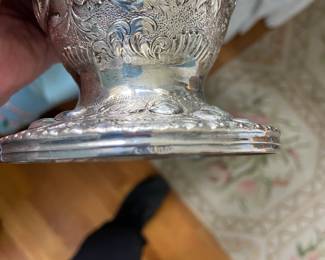 STERLING SILVER: Important Kirk Repousse Coffee/Tea Set in the House/Castle pattern. .Small Silver Tri Handled Trophy Style Carnegie Mellon covered cup by Gotham, Georg Jensen Cocktail Shaker, Georg Jensen Tongs, Sterling Letter Holder, Large Sterling Inkwell, Antique Chased Silver Salver, Silver Revere Bowls, Kirk Repousse Large Bowl, Gotham Scallop Pattern Dishes, 2 Tall Chased Candle Sticks, Other Candles, 2 Early hallmarked Master Salts with glass inserts, Antique Hallmarked Handled Pourer, Salts/Peppers, Plates, Sugars, Creamers, Asian Style Vase by Grogan Co., Silver Humidor, Water Pitcher, Hallmarked Tea Caddy, Misc. Flatware, more…..