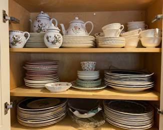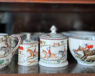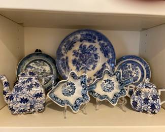 PORCELAINS, POTTERY, CHINA: Pate sur Pate 12 plates by Mintons as well as cups and saucers- artist signed Birks. (Albion Birks). Large assortment of Herend, Mintons demitasse cups with Wedgewood Style heads, Many Boehme Birds and Cheetah, Imari, Cauldon, Flow Blue, 12 Yale Plates by Wedgwood, Dr. Wahls China, Luneville Dinner Set, Chelsea, Copeland China with Dragon Crest, Copeland Demitasse Set, Asian Blue and White, Canton, Nanking, English Transferware, Willow Ware, Pearlware, Staffordshire, Maruri, Huge assortment of Quimper, Meissen, Dresden, Large Collections of Wedgewood, Dozens of Trinket Boxes, Bough pots, Tobacco leaf bowl, Booths, Commerative plates with Eagles, Garden Barrels, Majolica, European Earthenware, So much more.