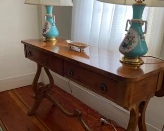 FURNITURE: This house represents generations of styles and tastes including: 2 Inlaid George III Servers, Large ornate oak China Cabinet, Victorian Burled 3 part china cabinet, Large Mahogany Dining Table with 12 newly upholstered Regency Chairs, Round Country Dining Table with Windsor chairs, Many Beautifully upholstered couches, chairs, ottomans (this home boasts several dens and living rooms), Many Candlestands, Bible Stands, Many benches including fireplace benches, Several antique gaming and console tables, Many 2 drawer work stands, Commodes, 2 slant lid early desks one with fantastic eagle handles, Several other desks including lady’s desks, Abattant, Flat tops, Many Antique Chests and Bureaus, Antique drop leaf Tables: (Dining, Pembroke, Country, Side Tables), * Simply Gorgeous 1820’s Sofa with Exquisite upholstery and Carved Eagle feet*, Tavern Tables, 10 foot long tavern table, Washstands, Several sets of Beds, Lady’s vanities, Large Regency Corner Cabinet, Victorian display case on cabriole legs, Library Table, Round ormolu display table, Library Stairs, Chaises, …