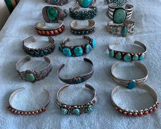 JEWELRY: The owners enjoyed staying out west and brought back not only rugs and art but a great selection of South Western Jewelry including: many Squash Blossom Necklaces (Silver, Turquoise and Coral are represented), Many Sterling Bangles with Coral, Turquoise, and Beading, Silver pins with Turquoise and coral and Silver Inlays, Several Leather Belts with Silver Belt buckles (many craftsman including David F. Garcia), Earrings, Turquoise and Coral Necklaces, Other beaded Necklaces. Rings. A fun assortment purchased at reputable galleries such as Morning Star Traders in Arizona and Medicine Wheel Studios in Wyoming. Plus more.